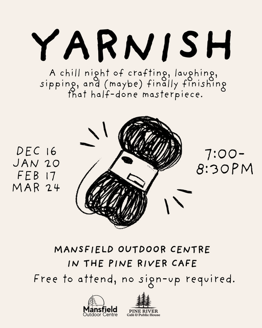 Macramé, mosaics, mismatched sock darning—whatever your crafty jam, bring it along and join us fireside at the Pine River Café! It’s a no-rules, all-fun evening of making, mingling, and maybe even mostly finishing that half-done project you’ve been ignoring. The café will be open with hot drinks, cold sips, and cozy vibes. Come for the crafting, stay for the laughs—glue guns and glitter welcome (responsibly). No Charge. No registration required.