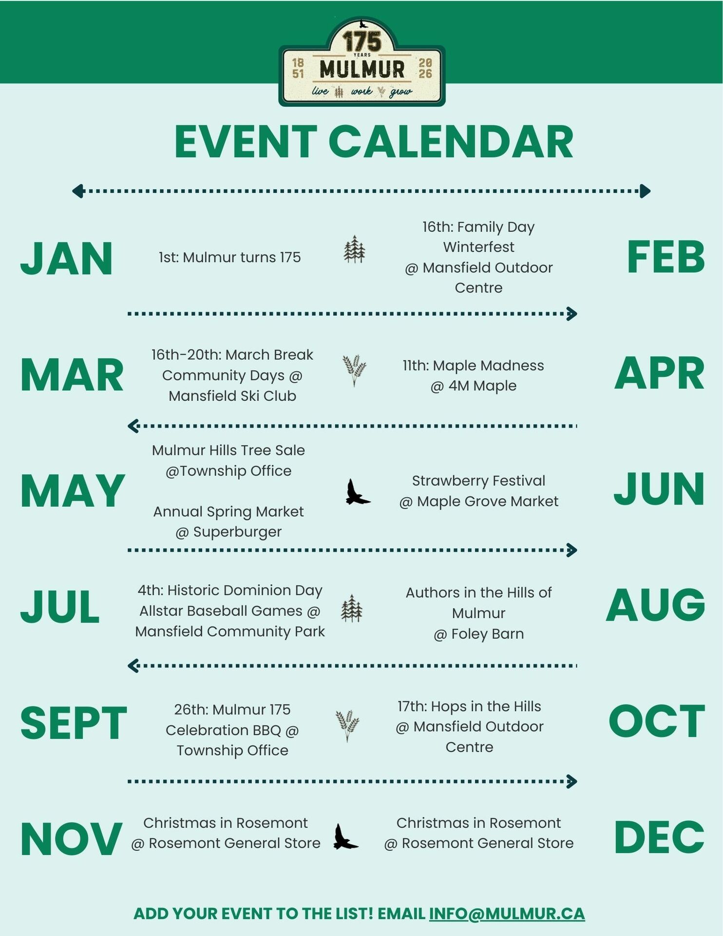 We invite you to celebrate Mulmur's 175th Anniversary by ordering a shirt, sweater, or hat as we explore our local history, enjoy community events, and reconnect with neighbours and friends.