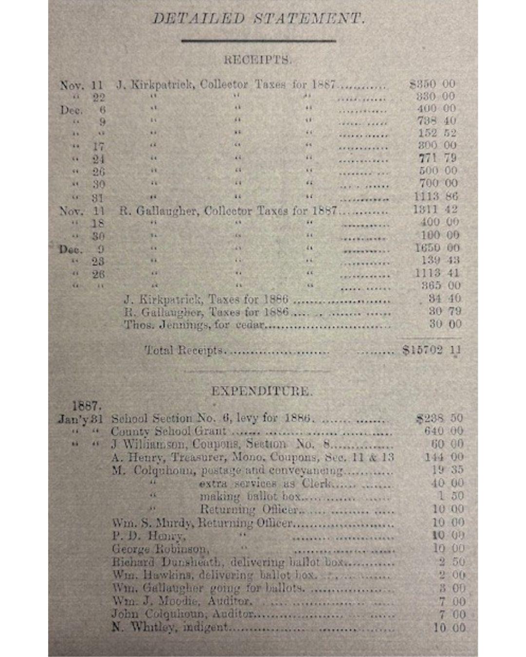 Photo: Excerpt from John A. Love’s Township of Mulmur Abstract and Detailed Statement of Accounts for the Year 1887 Photo Credit: Township of Mulmur