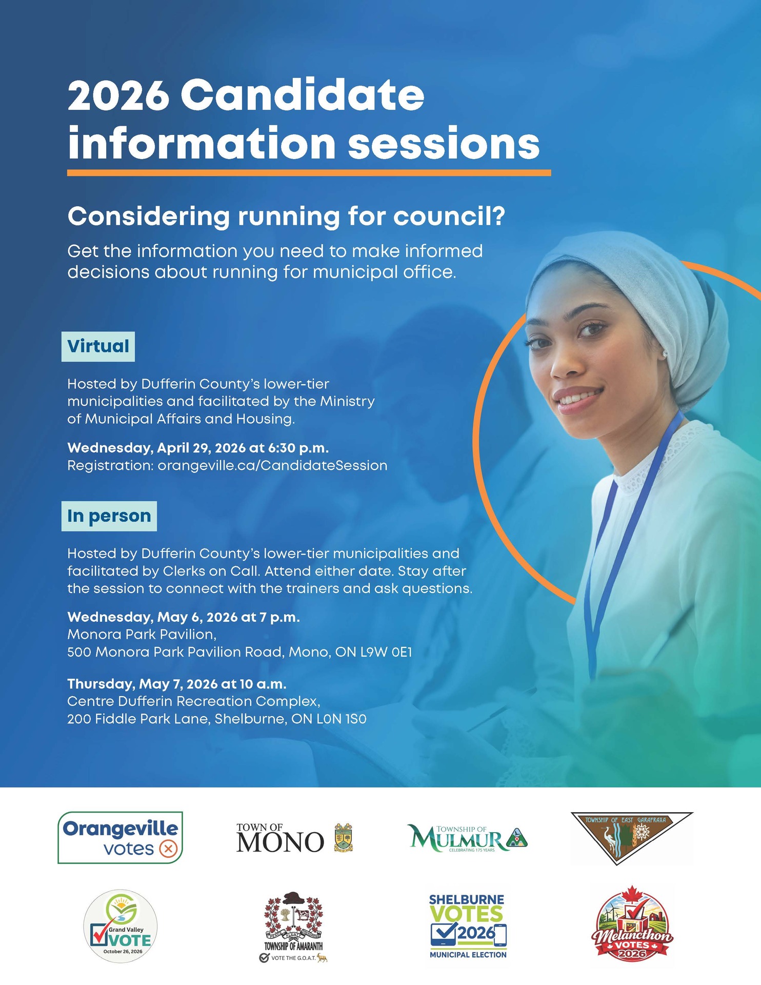 April 29, 2026 @ 630PM - Virtual: 2026 Joint Candidate Information Session (hosted by Dufferin County's lower-tier municipalities facilitated by the Ministry of Municipal Affairs and Housing) Register at: orangeville.ca/CandidateSession